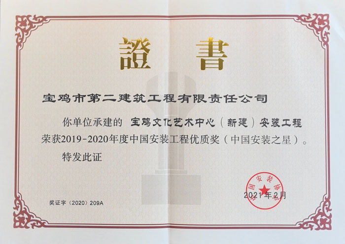 ?2019~2020年度中國安裝工程優(yōu)質(zhì)獎(寶雞文化藝術(shù)中心(新建)安裝工程)